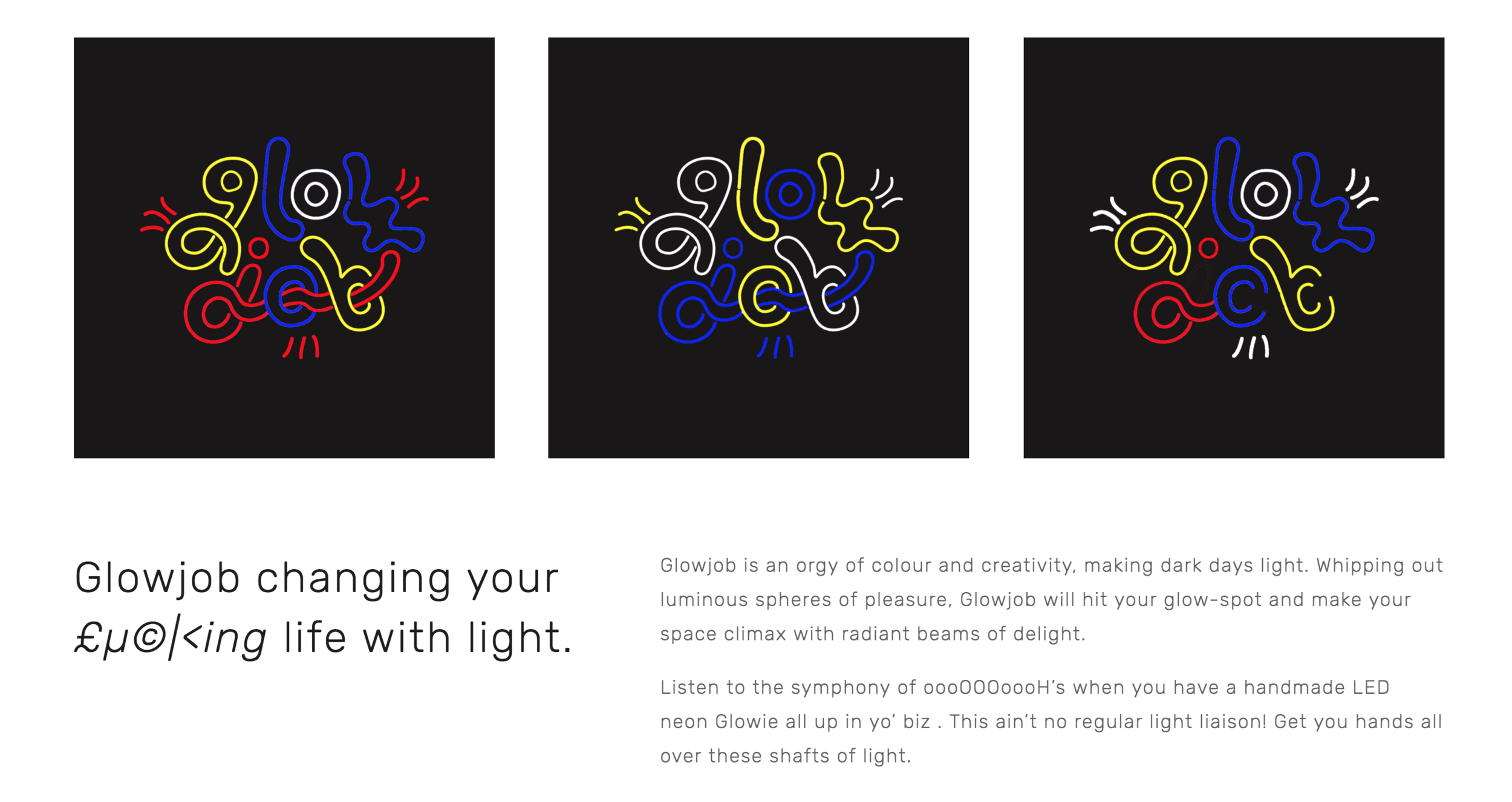 Glowjob is sexy! Hence it was important to manage the look and feel of the brand so the product could become the graphic embodiment of Barry White S-E-X-U-A-L. Glowjob required a full service design experience in terms of graphic identity and copywriting. Working in partnership with Glowjob the design process was used to ensured each facet of the rebrand packed a neon punch!