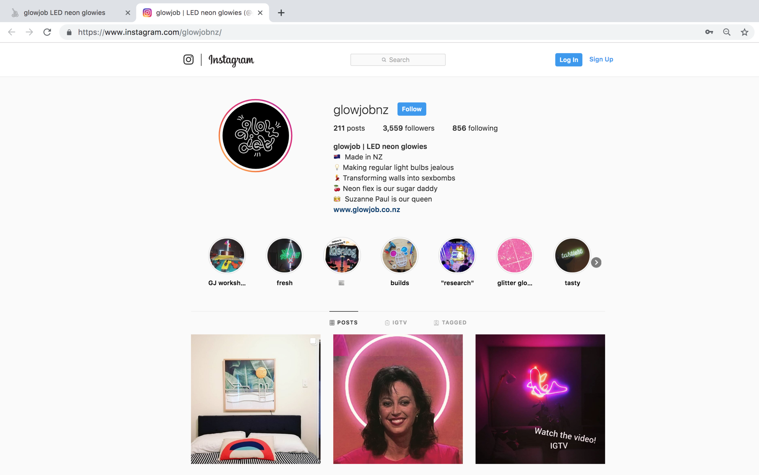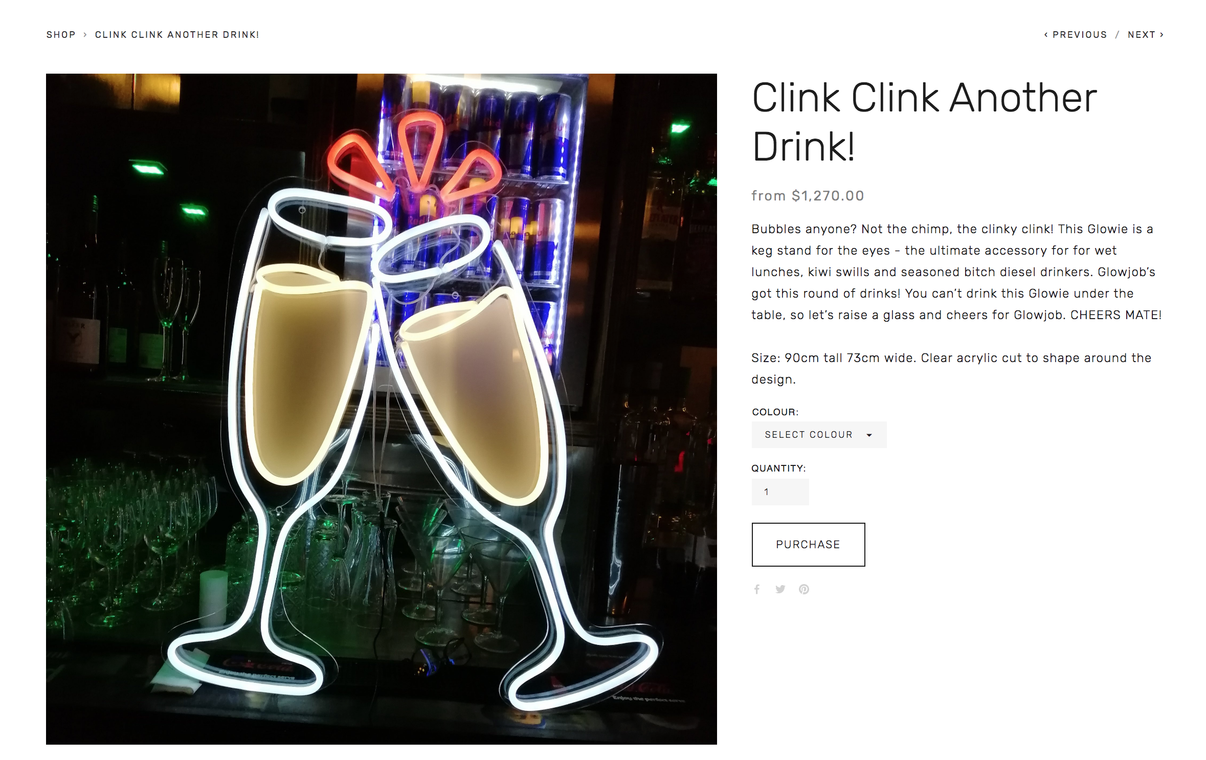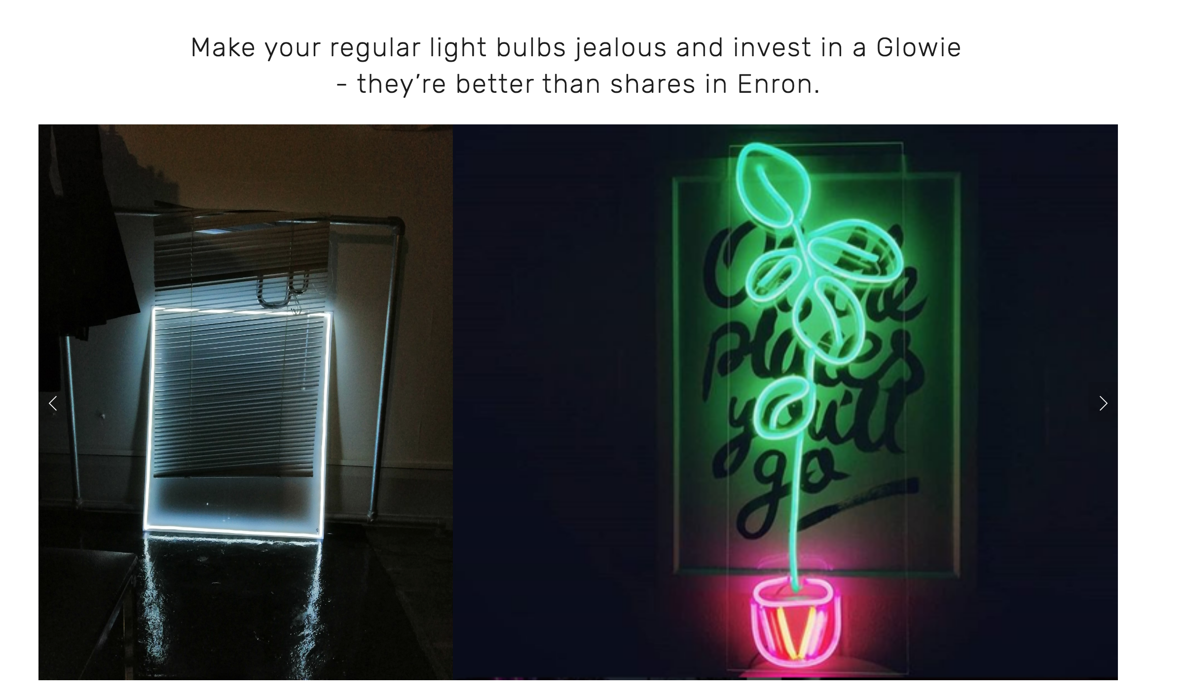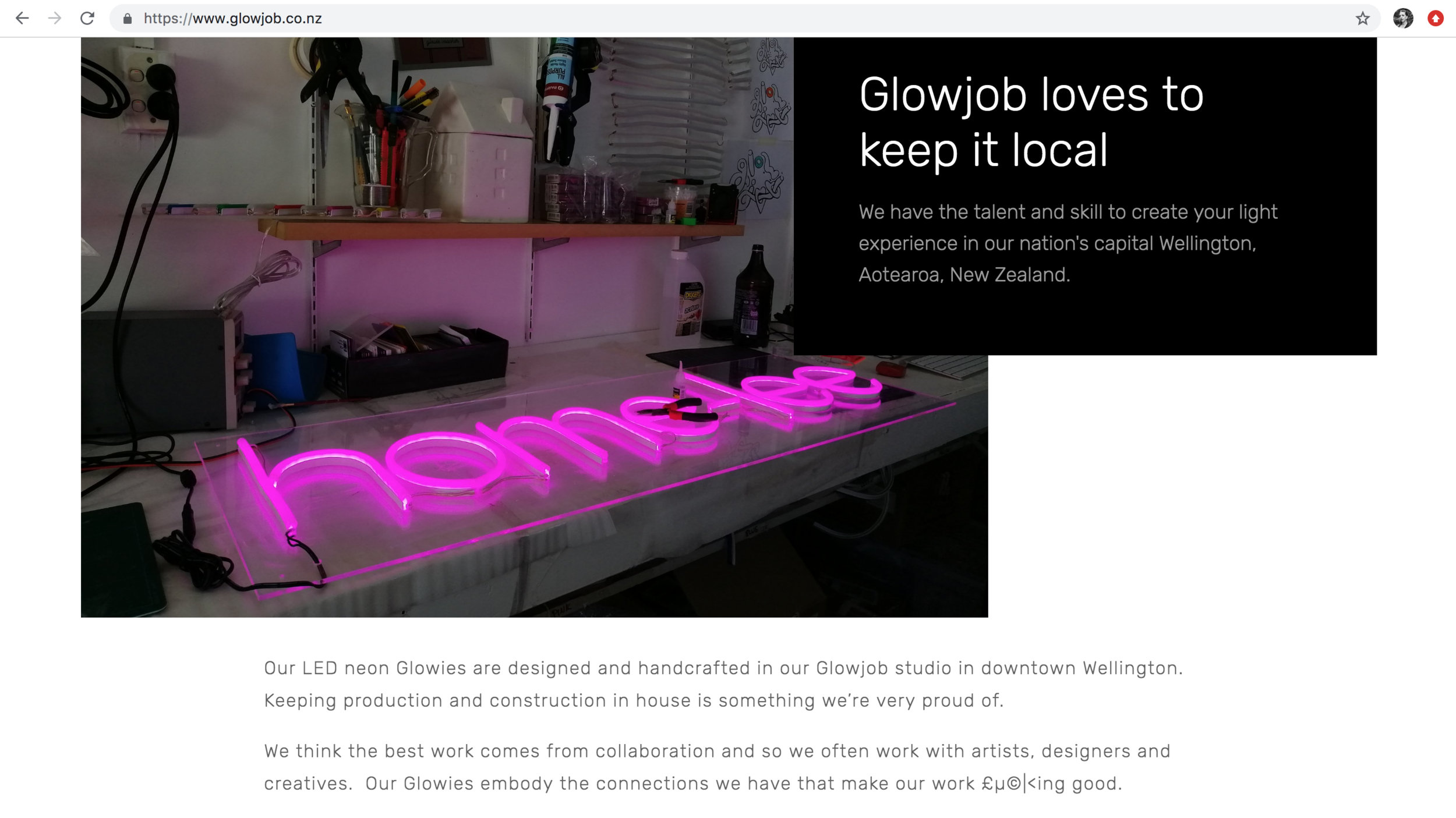 Copywriting for Glowjob required specific linguistic attention, especially experimenting with the playful use of the term Glowie a label used to describe Glowjob’s Aotearoa New Zealand made custom neon creations. Glowjob had clear ideas about what kind of direction and methods they wanted to employ.