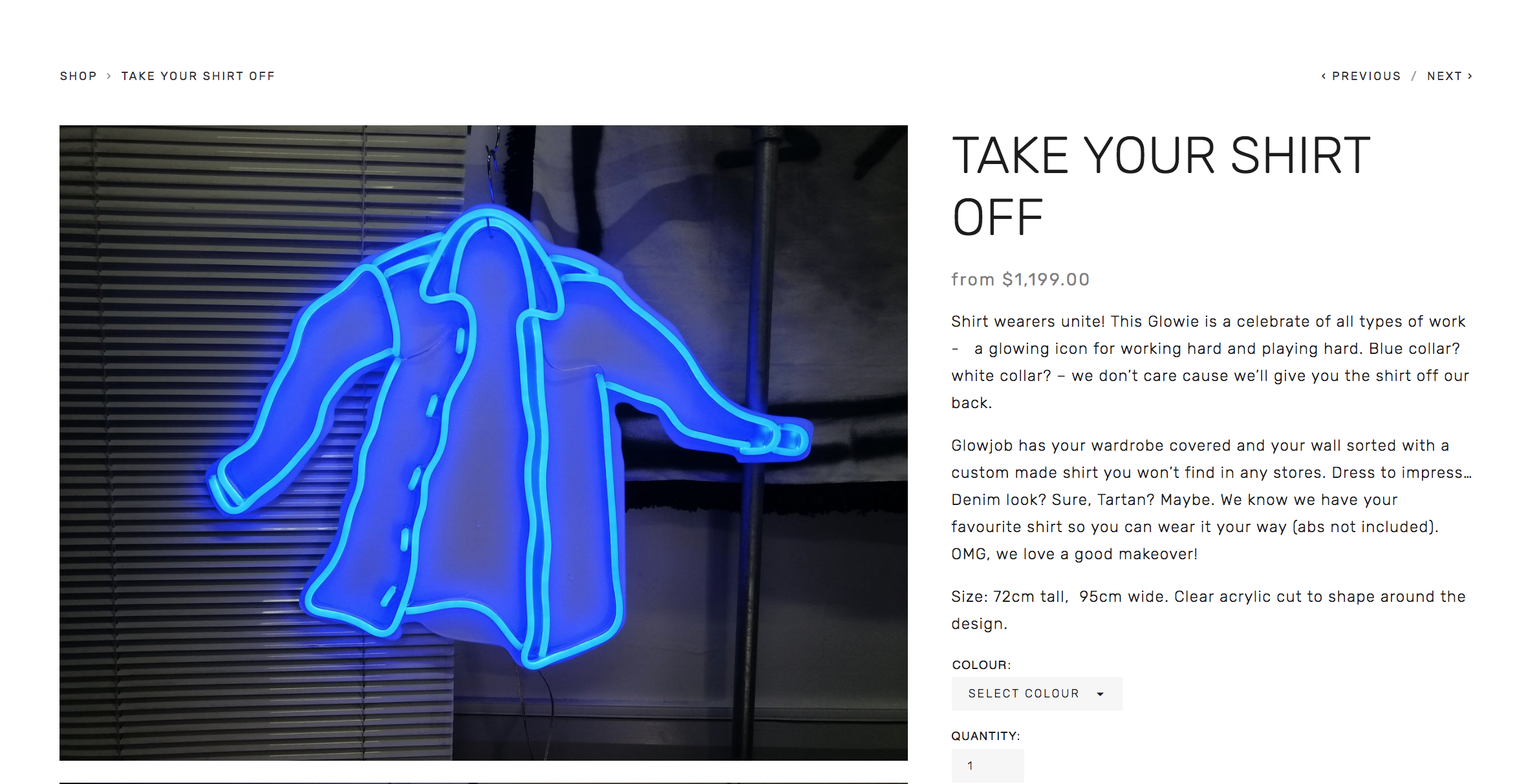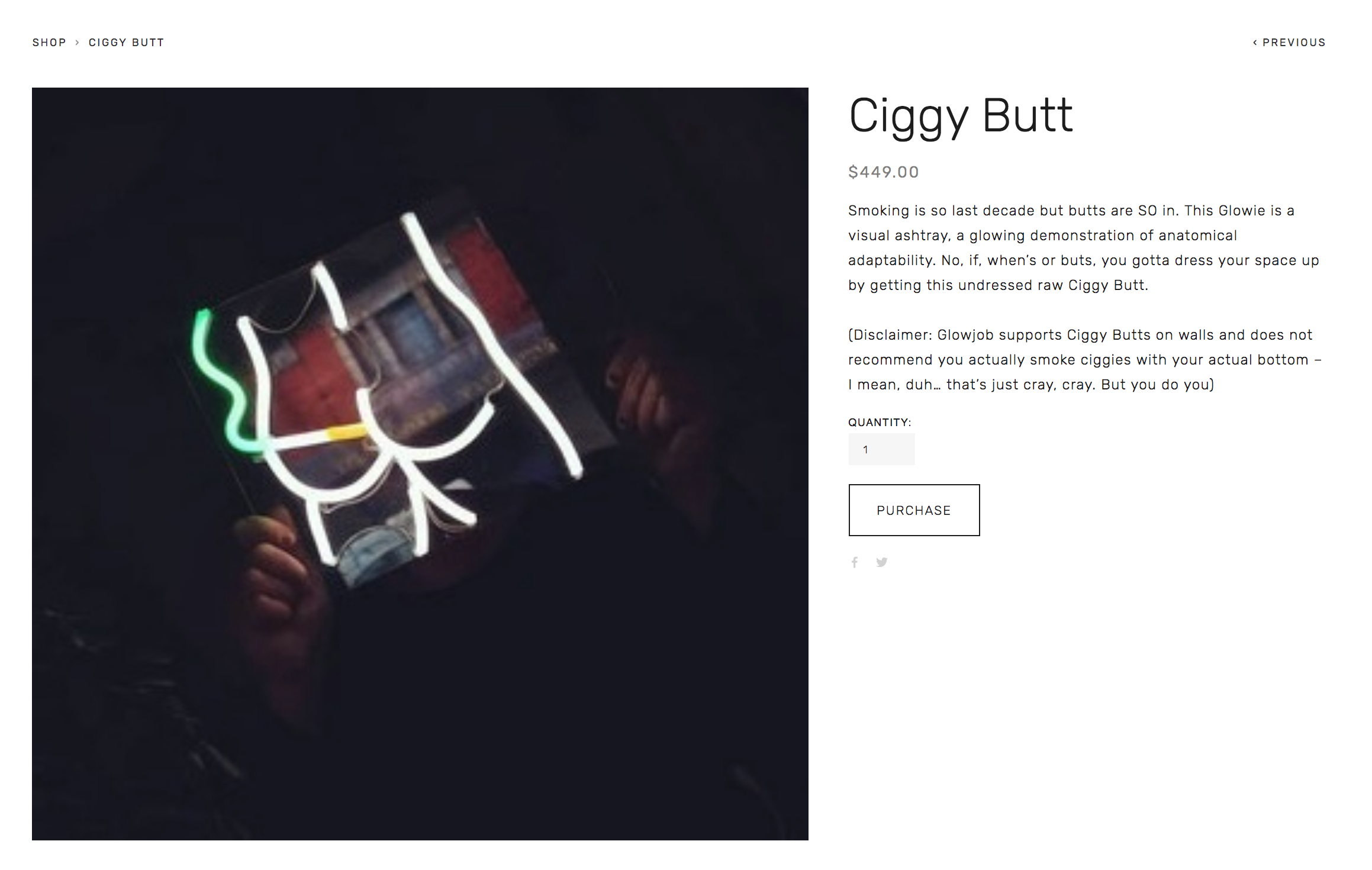 Glowjob’s online shop also provided an opportunity to reach new audiences and communicate Glowjob’s unique point of difference. Each individual Glowjob creation is called a ‘Glowie’ and for this reason individual definitions encapsulated the personality of the product and brand as a whole in the online shop.