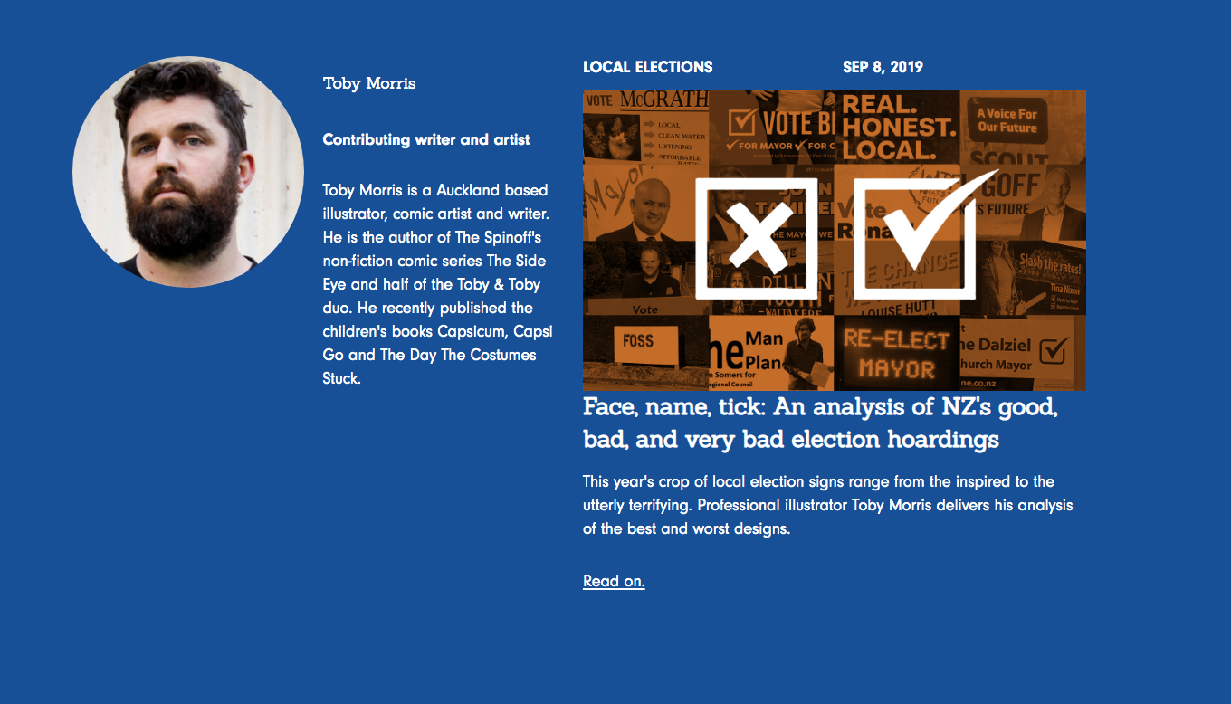 A national review of political design was instituted by The Spinoff’s Toby Morris who reviewed the nature and state of political musings during the election period. See the SANSON review below and full round up here.