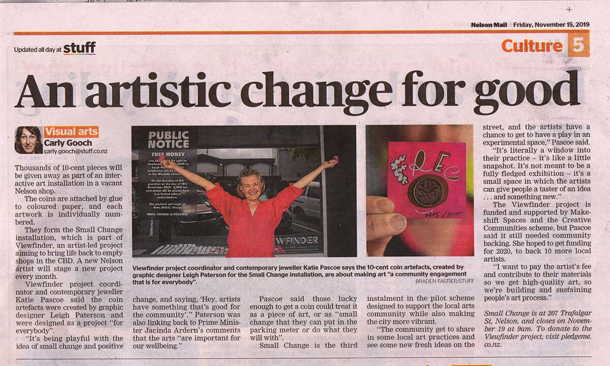 Small Change media review can be found here: https://www.stuff.co.nz/entertainment/arts/117272408/small-change-with-bigger-message-in-vacant-shop-art-project